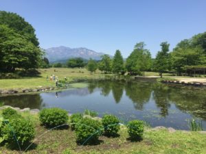 大きな池越しに日光の山々見える光景もよし。