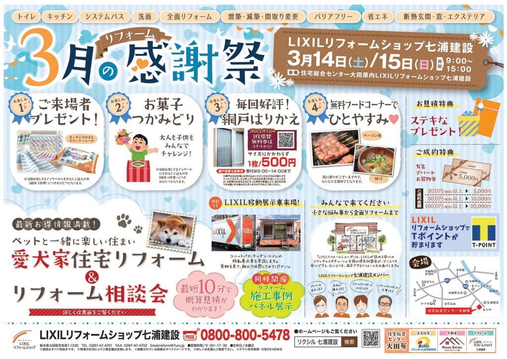今回は、3月14日・15日の2日間で開催されるLIXILリフォームショップ七浦建設の感謝祭のご案内をさせていただきます!!