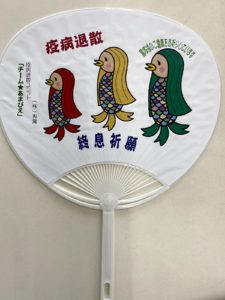 先日社長あてに業者様からうちわの自粛見舞いはがき(?)が届きました。