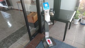 玄関に足踏み式のアルコール消毒器を導入しました。