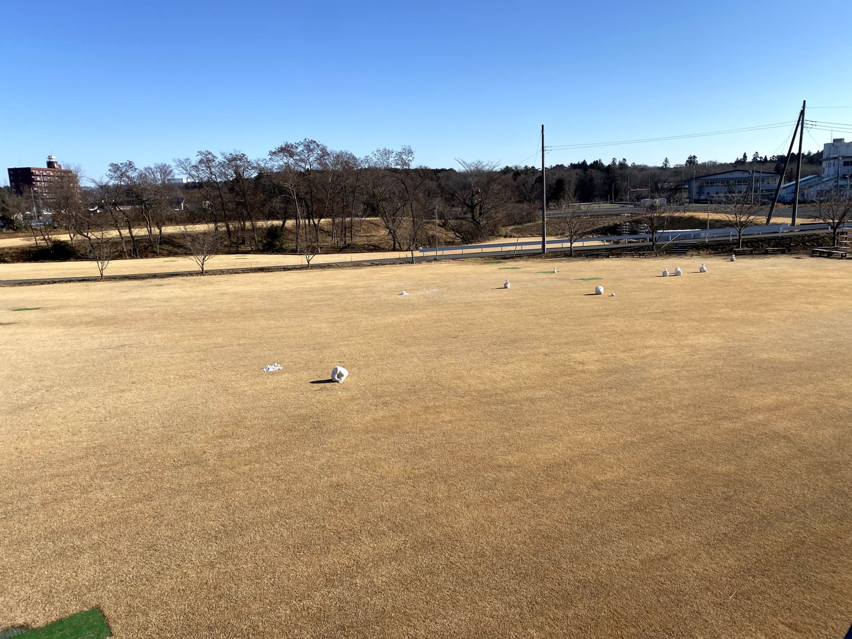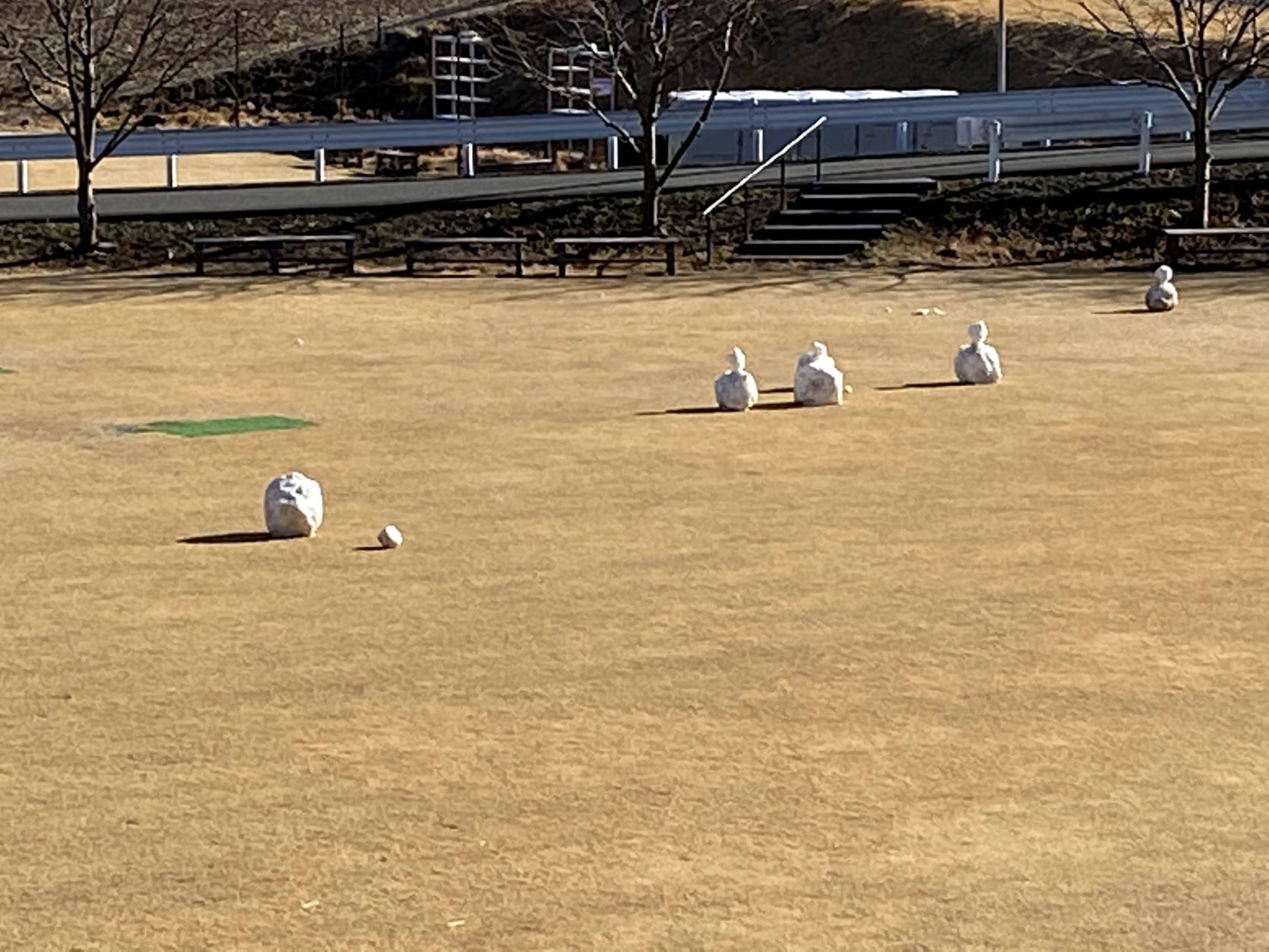 今朝、本社から見える景色に雪だるまが出没していました。