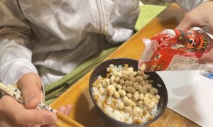 なんと、夜食の納豆ご飯に節分用の豆を乗せて食べていました。