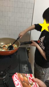 最後に、火を止めてカレーのルーを溶かす行程も子供にやってもらいます。