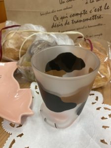 私は息子からお返しに可愛い三毛猫柄のグラスと食器、そして大好きなパンを貰いました。