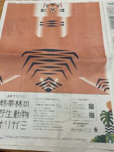 せっかくなので、新聞を切り取って折り紙を折りました。