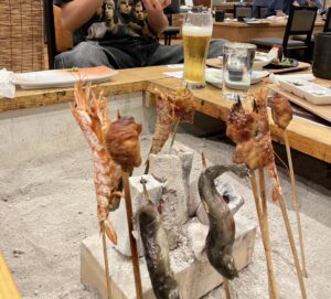 夕食も普通のバイキングではなく、囲炉裏を囲んでお酒に合う食材ばかり。