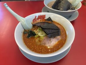 今回は辛味噌ラーメン+玉子かけごはん+餃子のセットでいただきました。